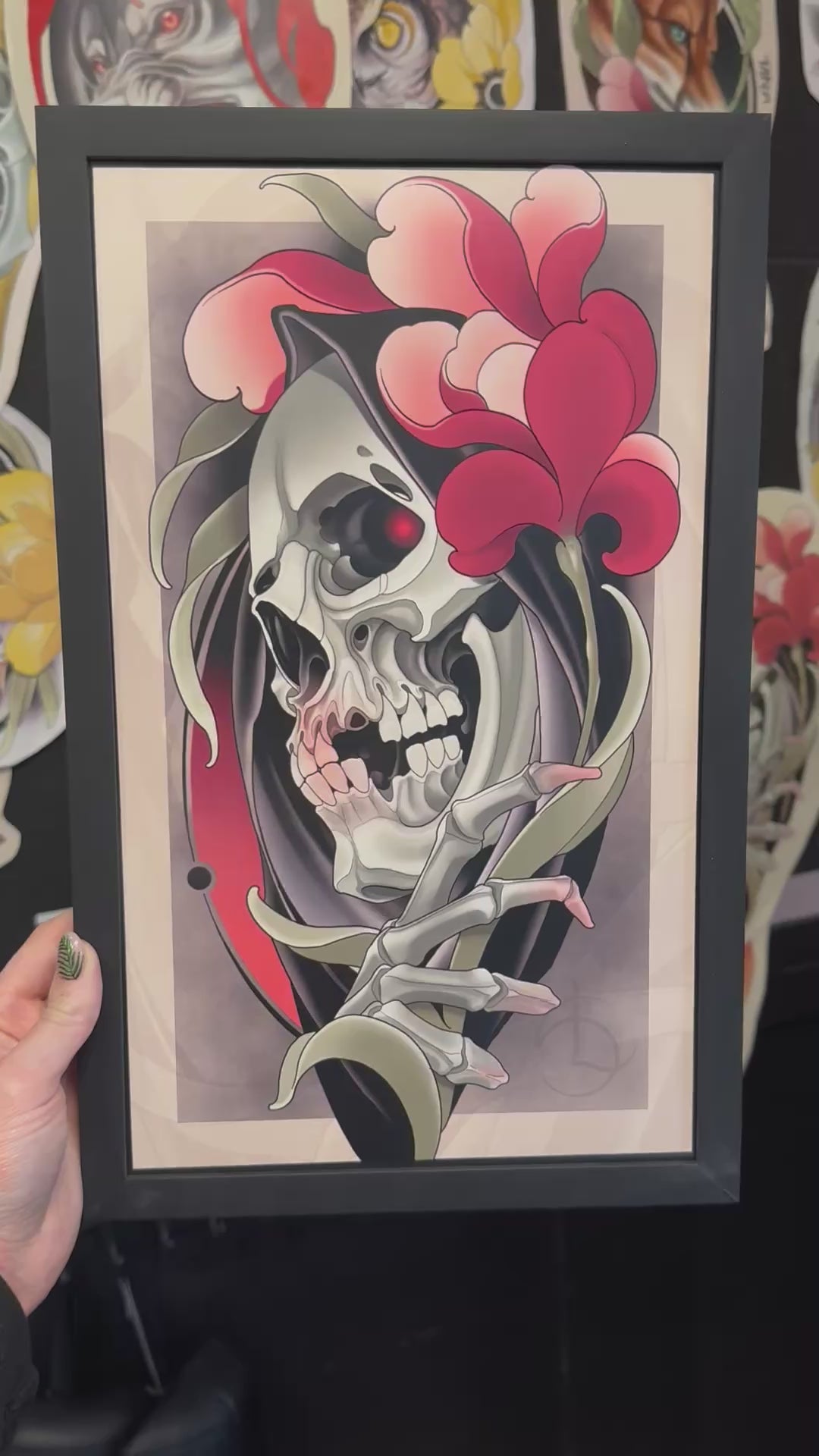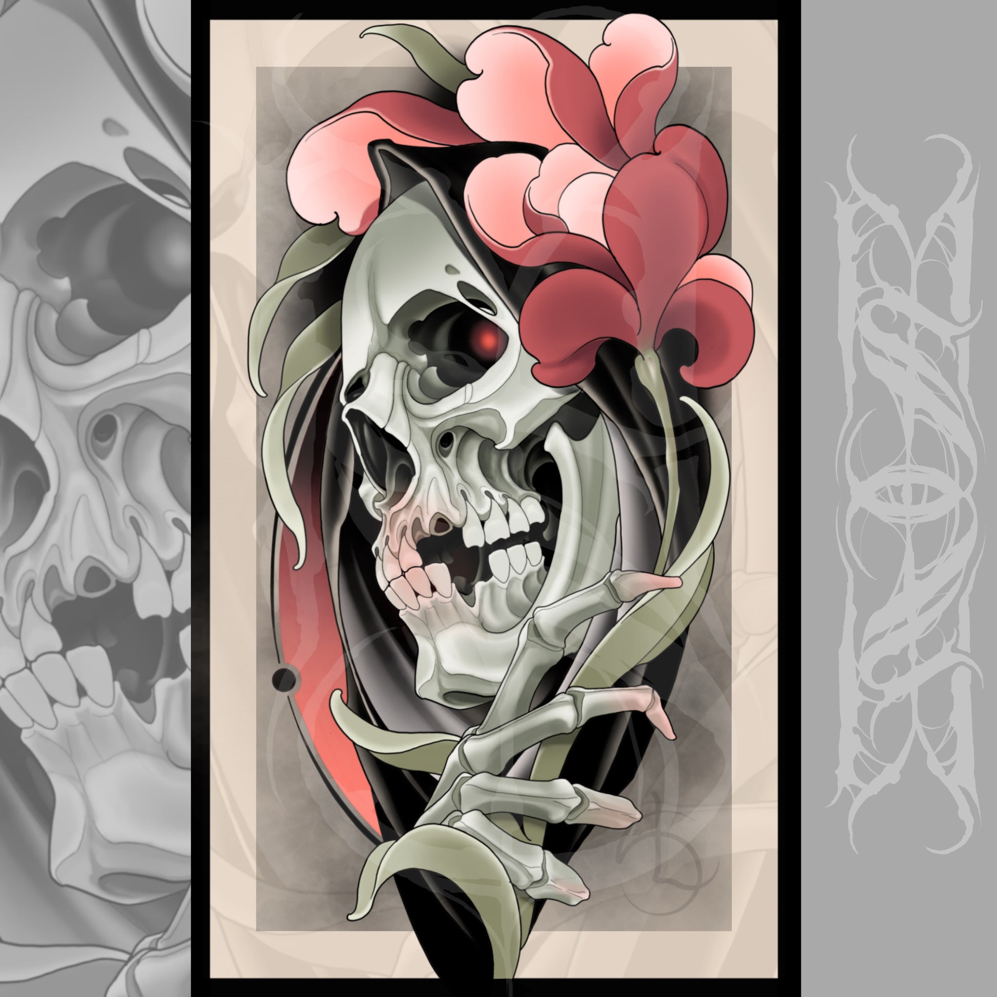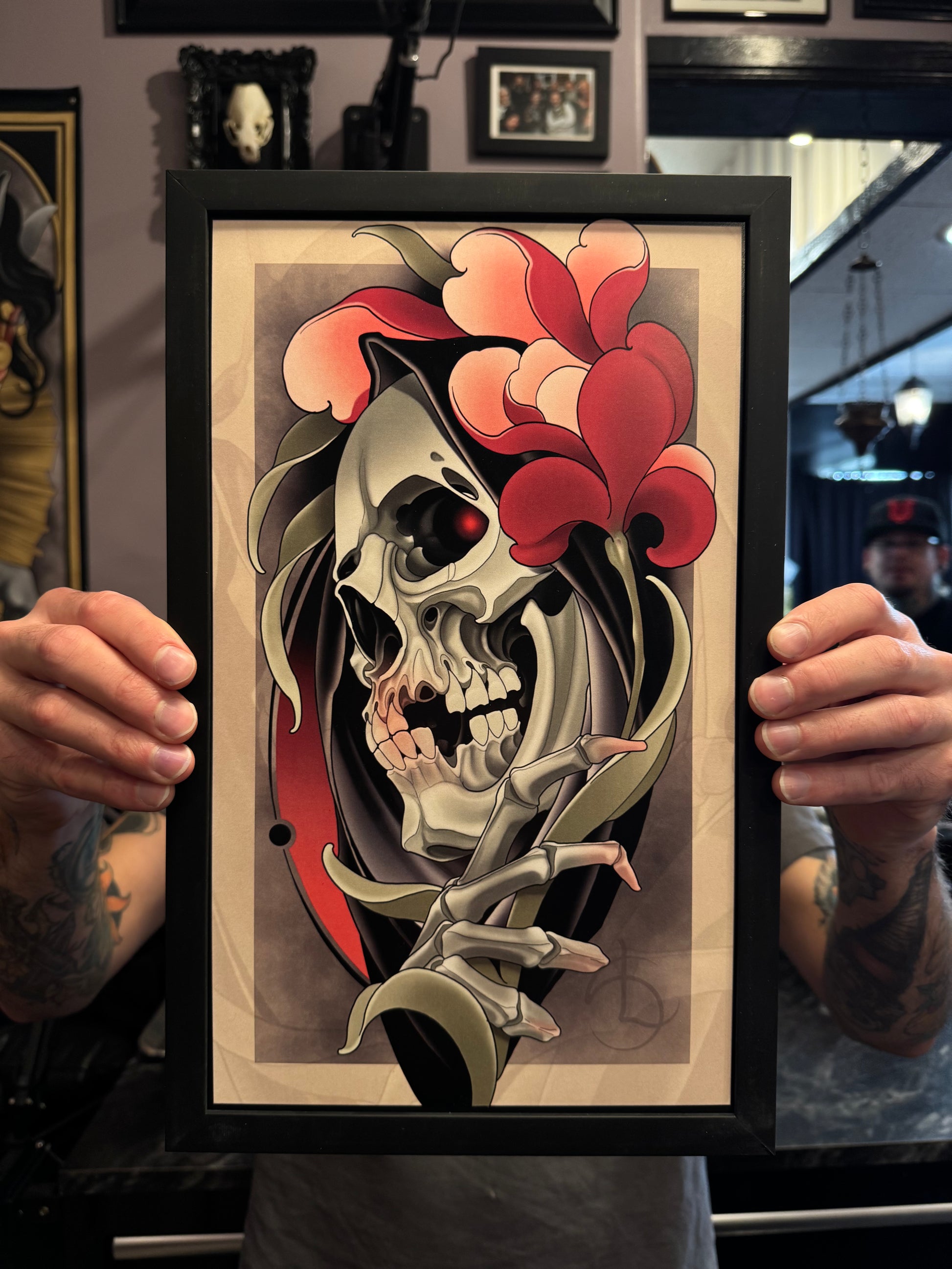 Neotraditional tattoo style grim reaper skull and florals art print by tattoo artist Sean Lisonbee (@sean_lazerbeam). Printed on 8.5x14" paper.