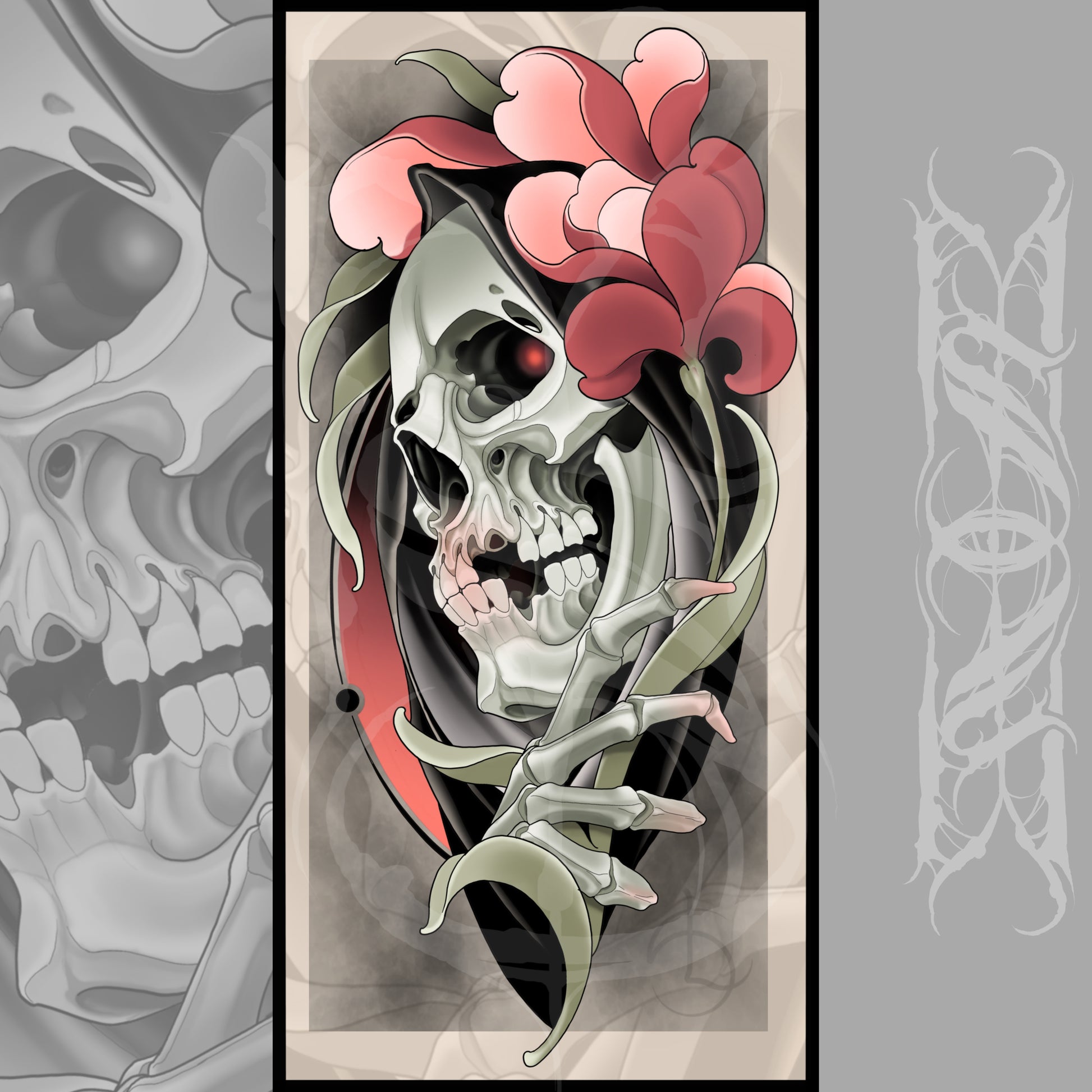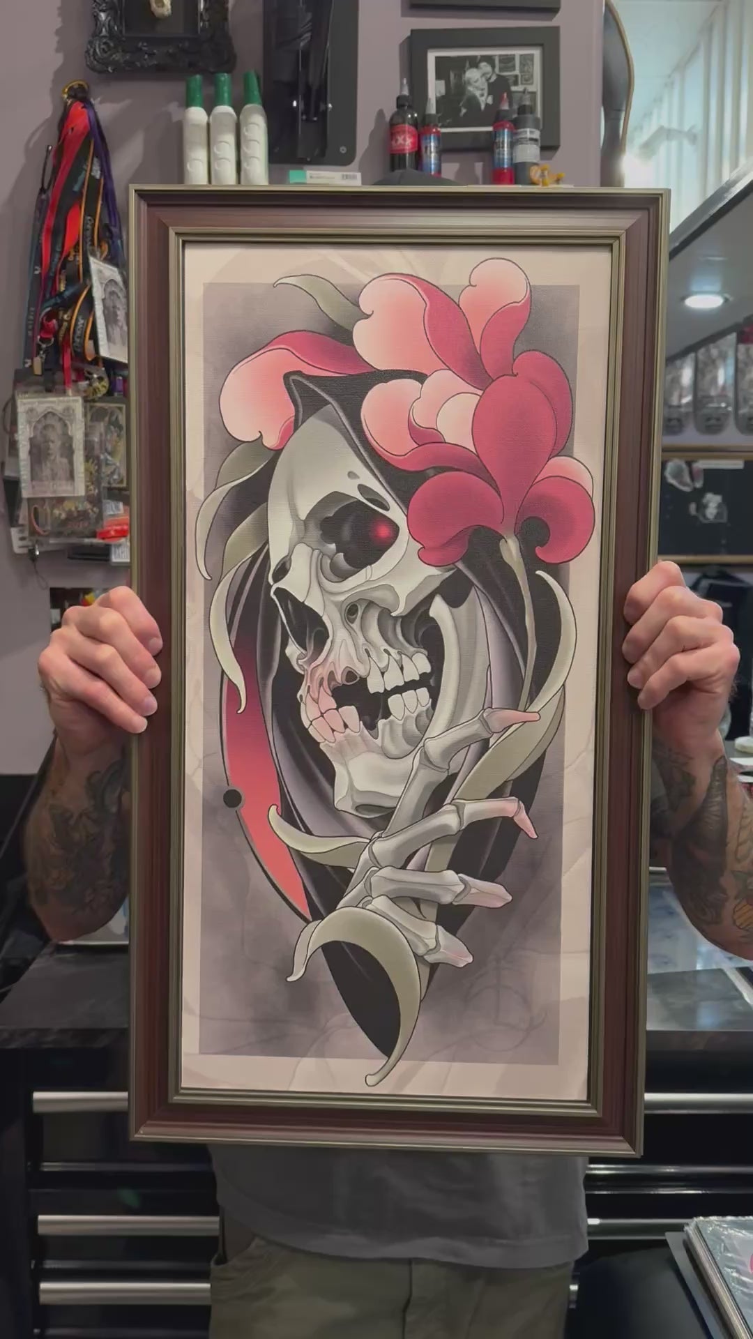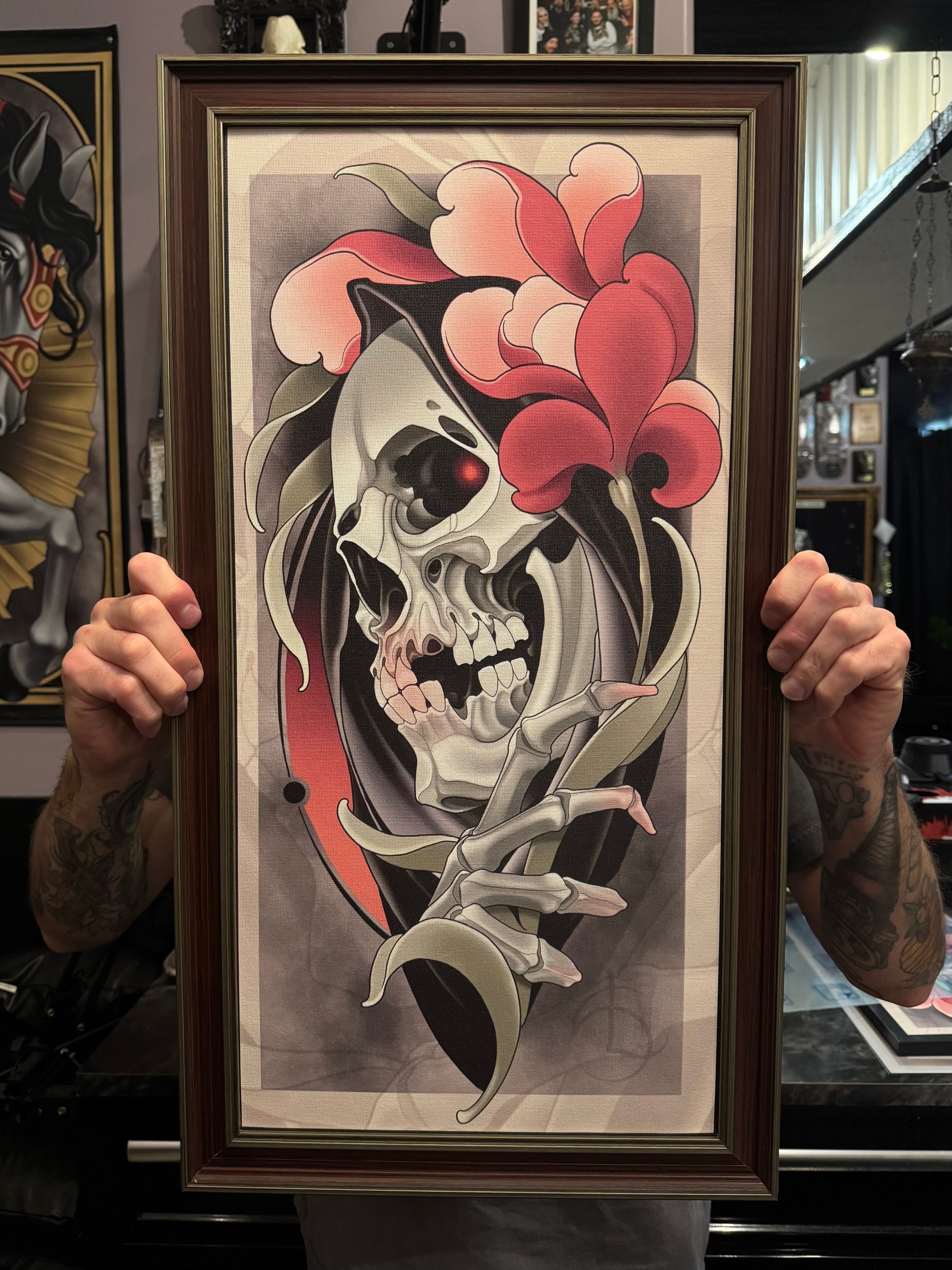 Neotraditional tattoo style grim reaper skull and florals canvas art print by tattoo artist Sean Lisonbee (@sean_lazerbeam). Printed on 12x24" canvas and coated in a glossy UV light protective coating.