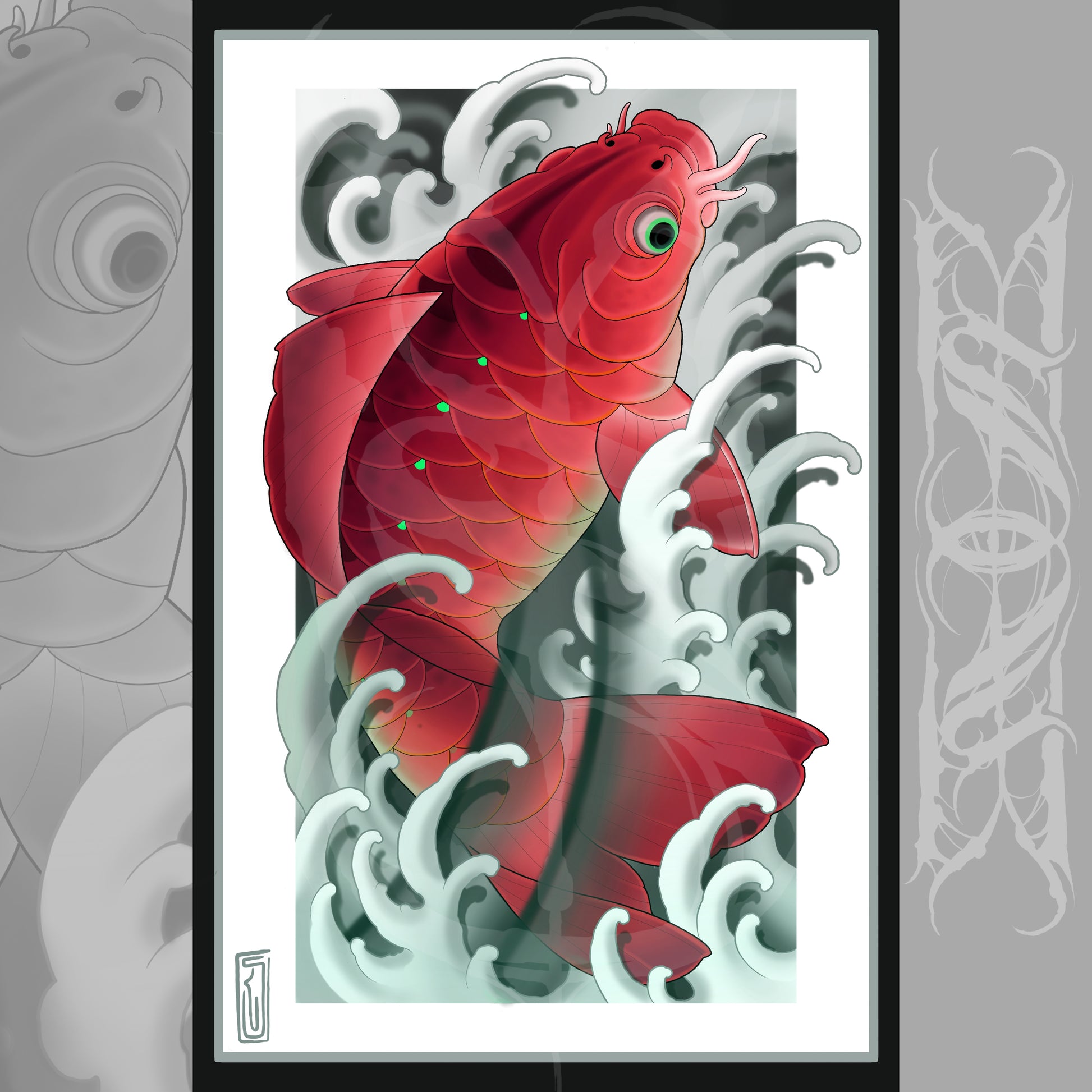 Koi fish Japanese neotraditional tattoo style artwork print by artist Sean Lisonbee (@sean_lazerbeam). Printed on 11x17" paper.