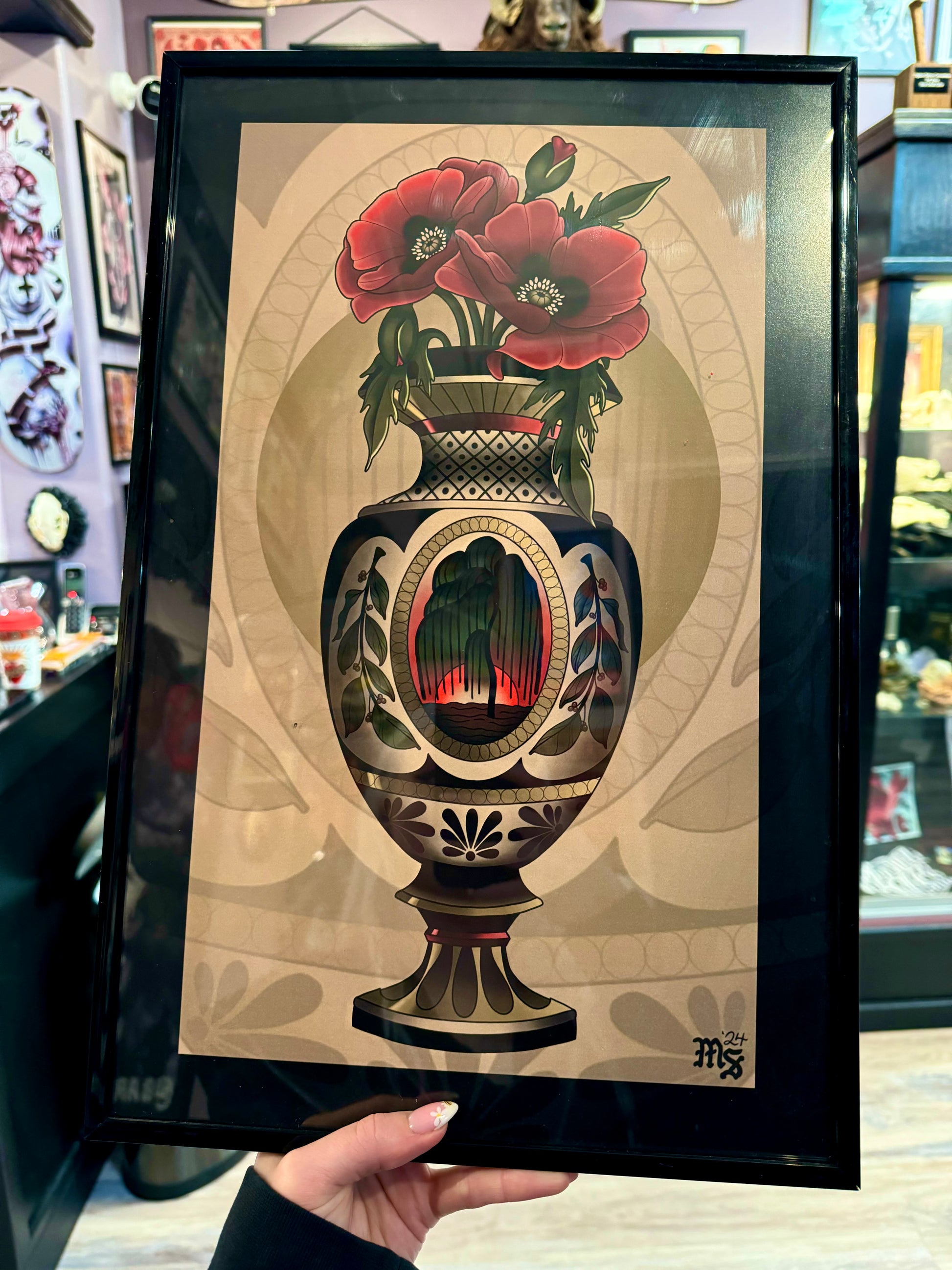 Memorial vase with poppy flowers neotraditional tattoo style artwork print by artist Maddie Stanger (@maddie_lazerbeam). Printed on 11x17" paper.