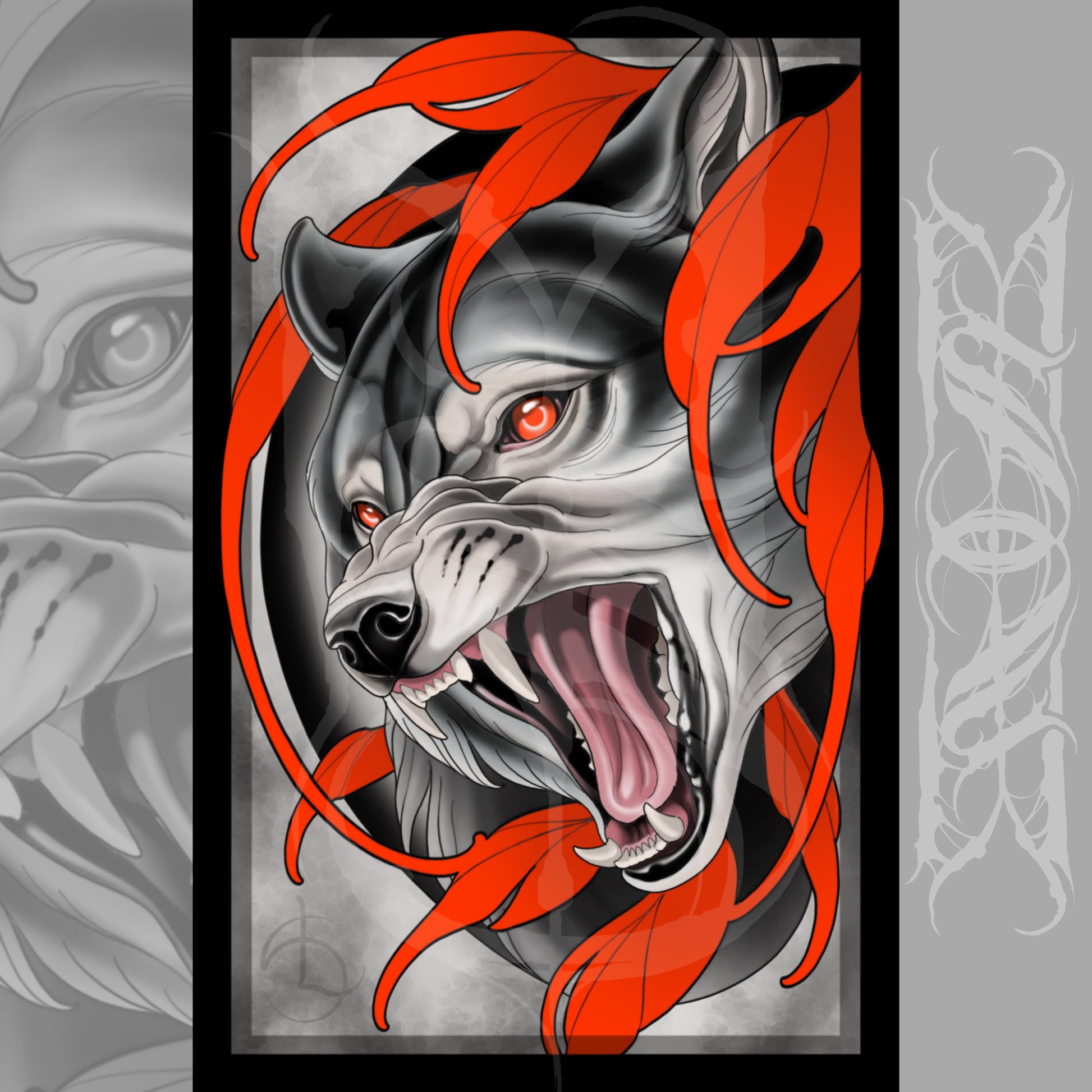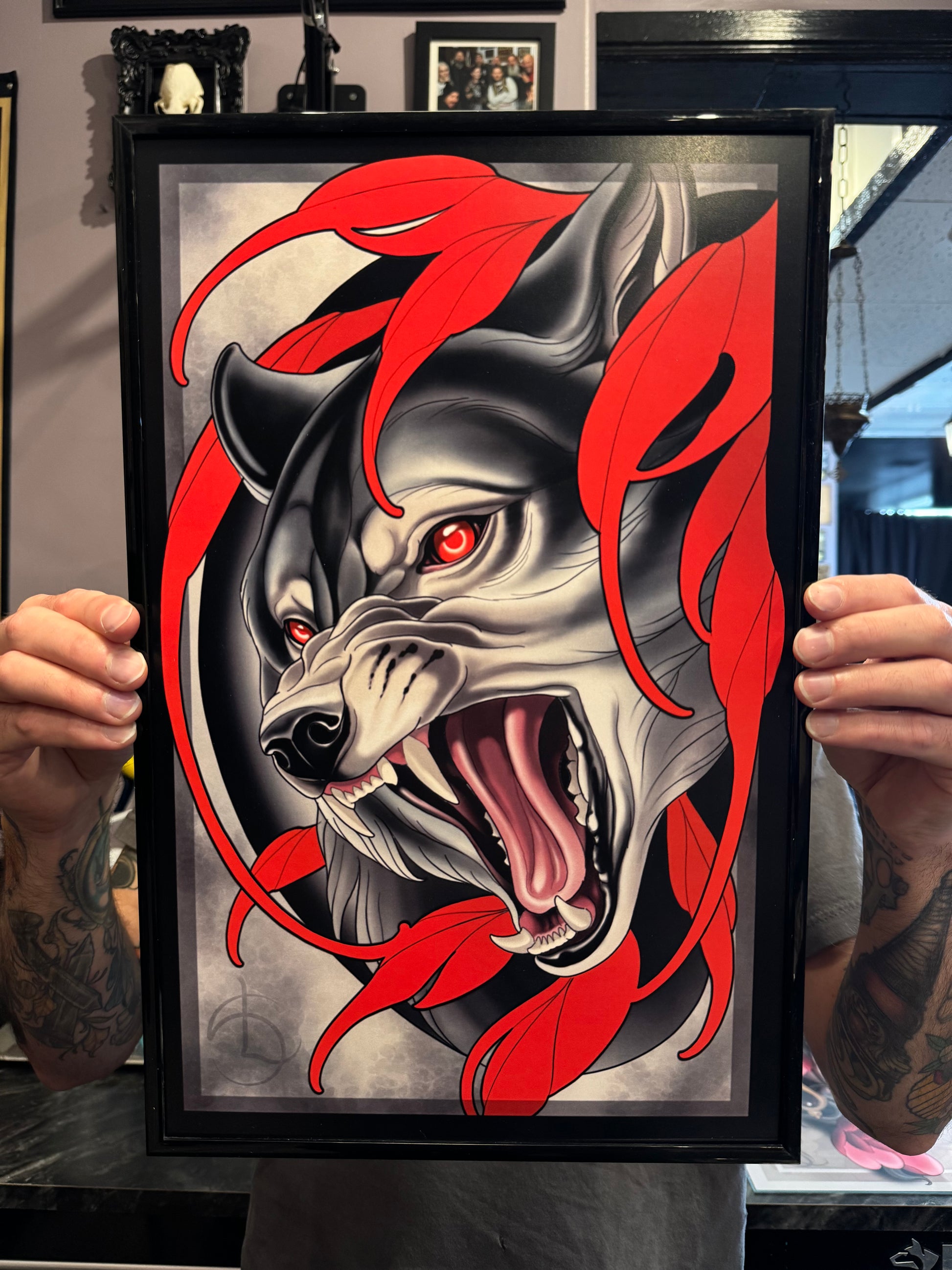 Neotraditional tattoo style snarling wolf art print by tattoo artist Sean Lisonbee (@sean_lazerbeam). Printed on 11x17" paper.