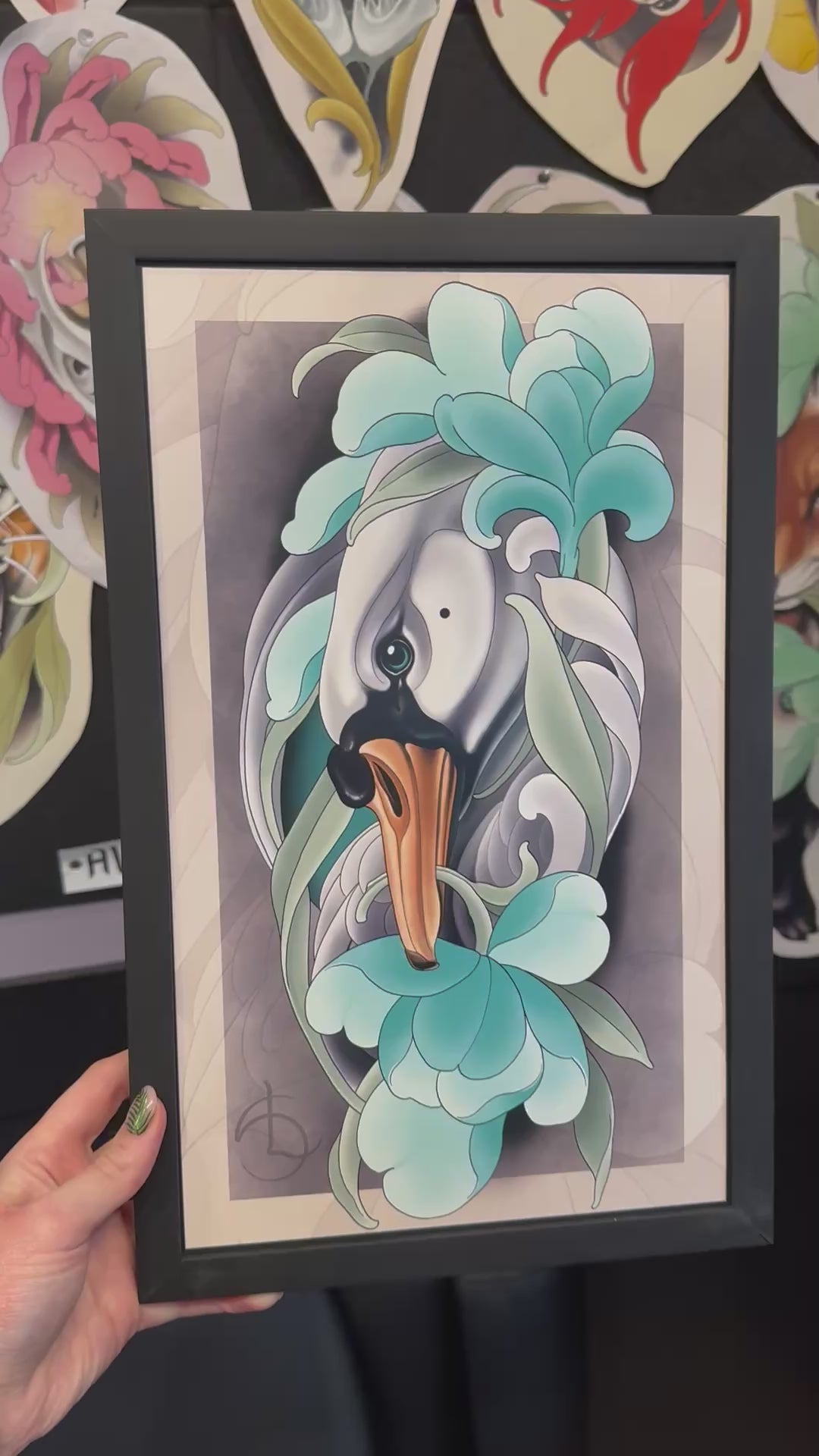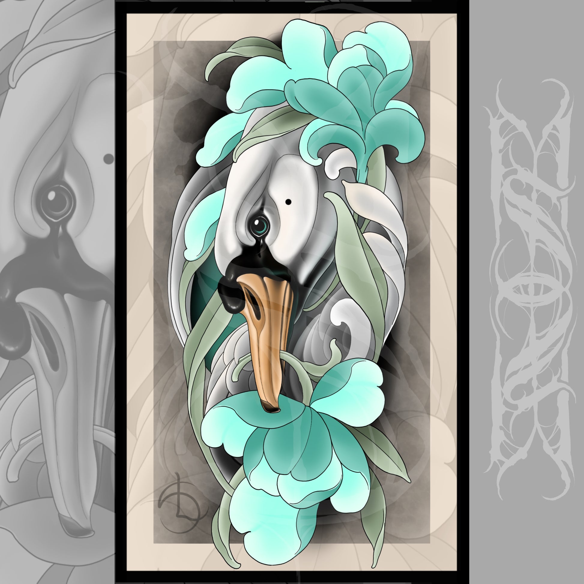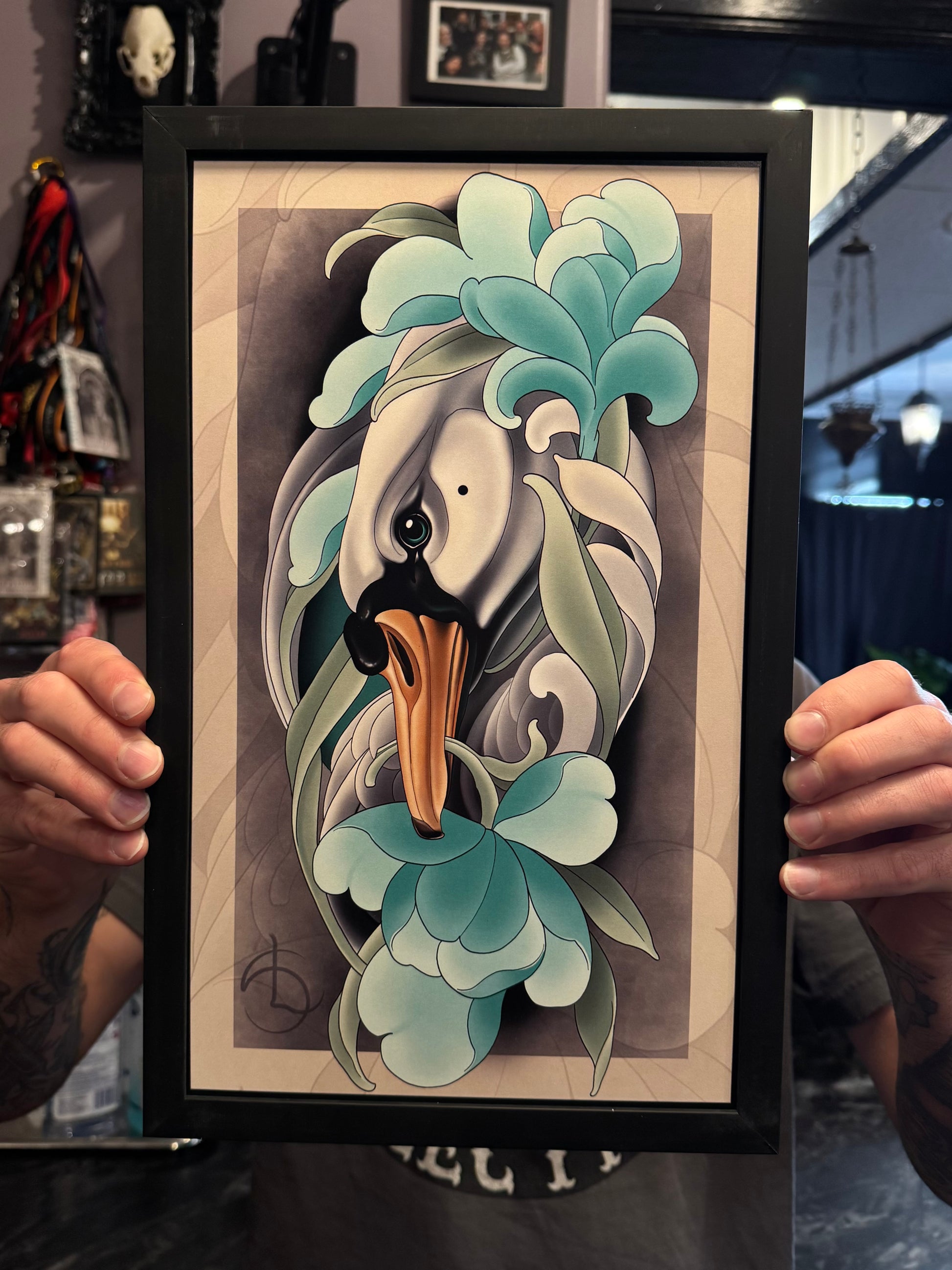Neotraditional tattoo style swan and flowers art print by tattoo artist Sean Lisonbee (@sean_lazerbeam). Printed on 8.5x14" paper.